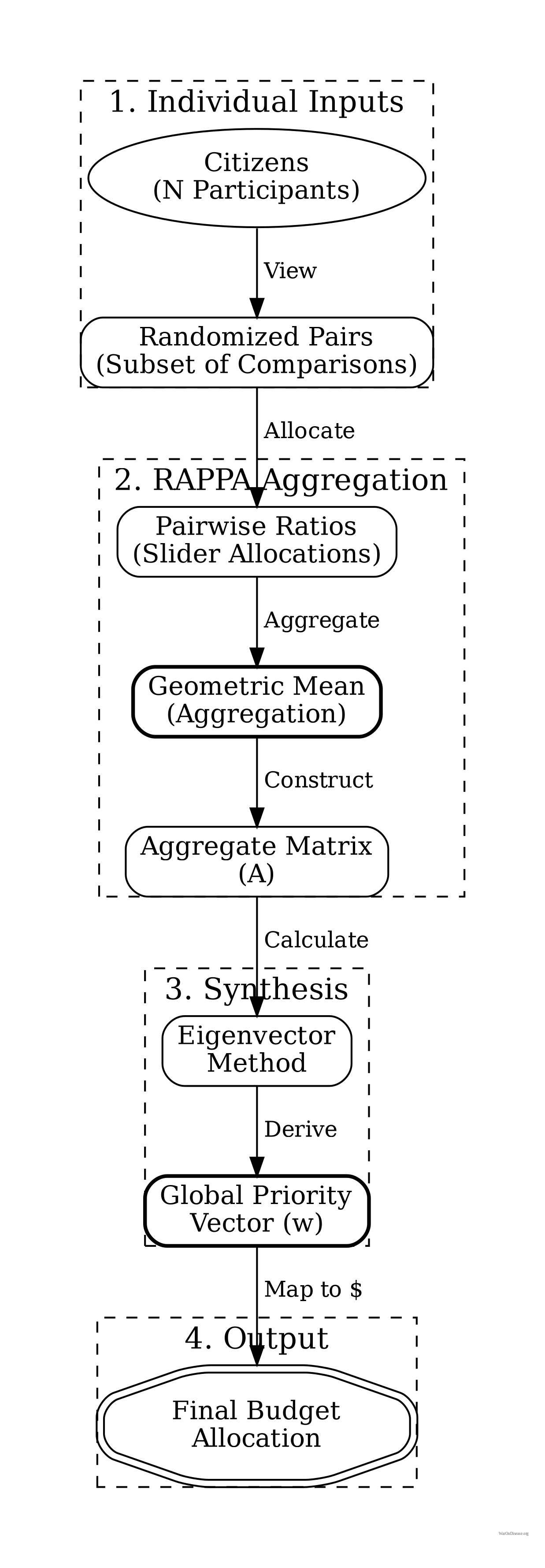 Cognitive Tractability: By decomposing n-dimensional budget allocation into pairwise comparisons (drawing on AHP), RAPPA respects the well-documented cognitive limit of \(7 \pm 2\) simultaneous comparisons, making participation feasible for all citizens regardless of education or available time.