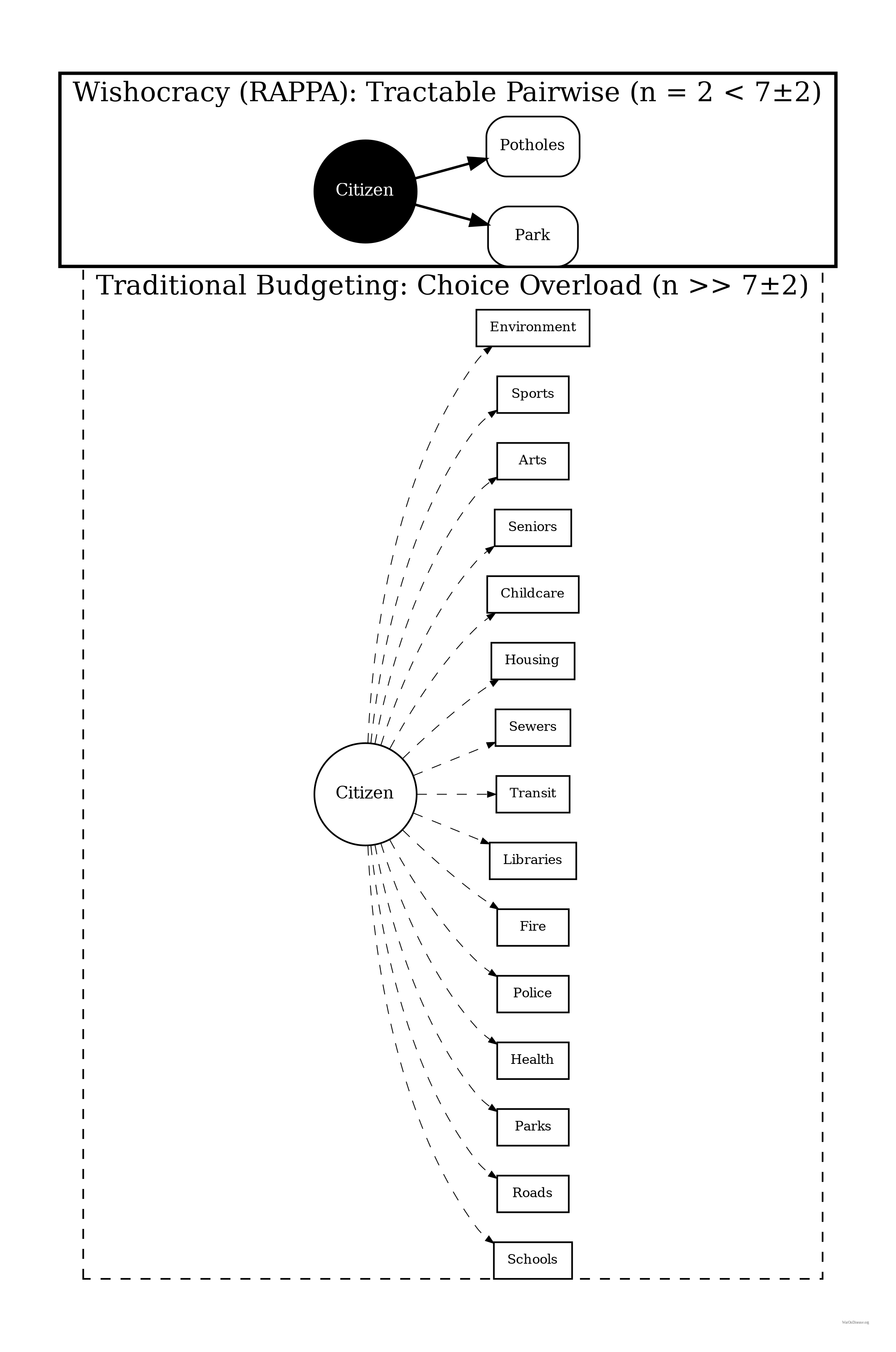 The fundamental problem is computational and cognitive. When citizens are asked to rank or rate dozens of competing priorities simultaneously, they face impossible cognitive demands. Research in behavioral economics has consistently demonstrated that humans cannot reliably compare more than 7±2 options simultaneously (Miller 1956). Humans struggle to make consistent judgments over large sets of options. Pairwise comparisons keep each decision local and cognitively manageable even when the full budget has thousands of items.