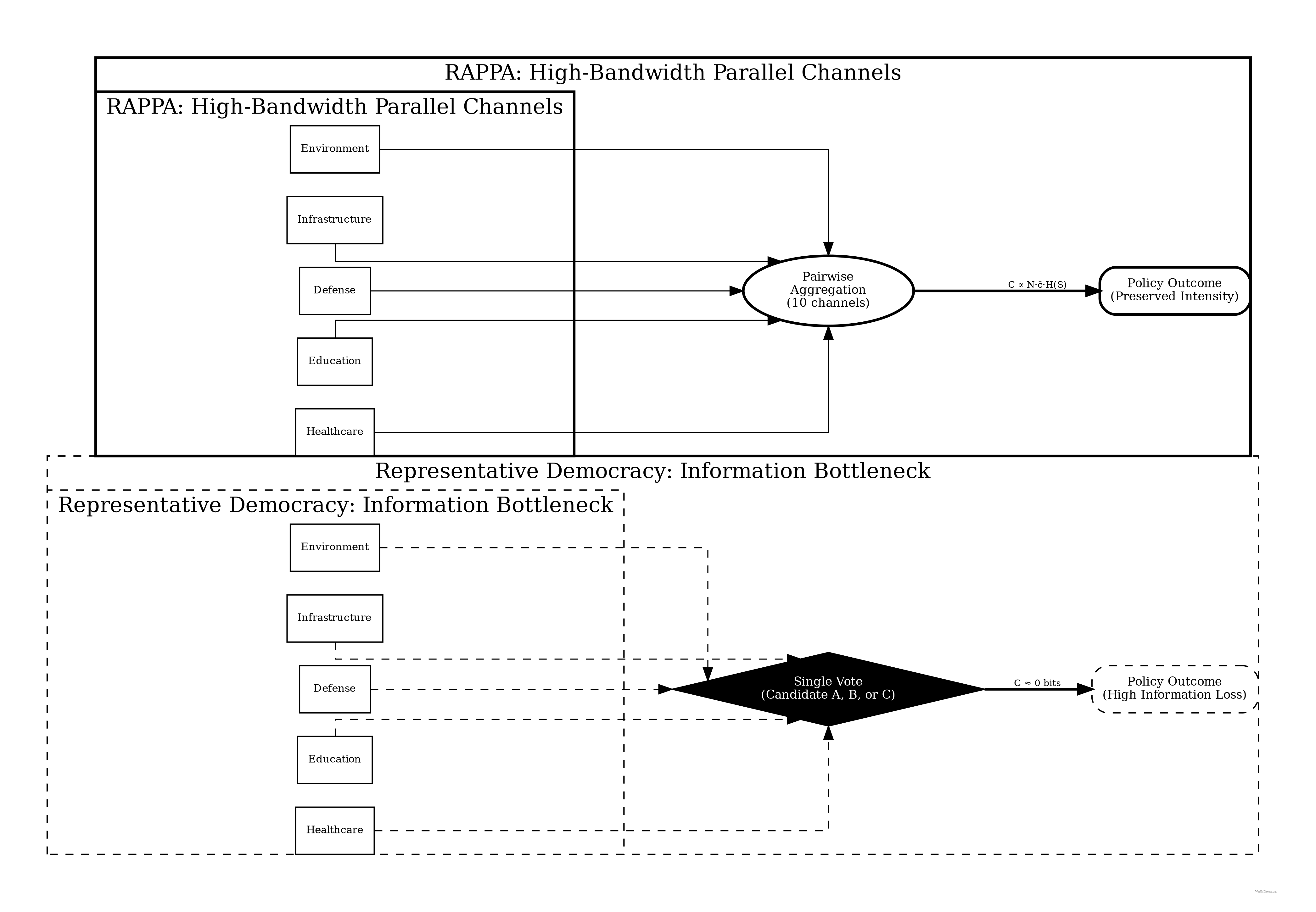 Proposition 1 (Information Loss in Candidate Voting): Let \(D_{KL}(P || Q)\) be the Kullback-Leibler divergence between true welfare preferences \(P\) and enacted policy \(Q\). As \(N \to \infty\): \[ E[D_{KL}(P || Q_{RAPPA})] \ll E[D_{KL}(P || Q_{Rep})] \] Argument (Sketch): By the Data Processing Inequality, post-processing (policymaking) cannot increase information. \(Q_{Rep}\) is derived from a signal with near-zero mutual information \(I(P; V_{Rep})\) due to quantization. \(Q_{RAPPA}\) is derived from a sufficient statistic of the pairwise matrix \(\mathbf{A}\), where \(I(P; \mathbf{A})\) approaches \(H(P)\) as empirical sampling density increases.